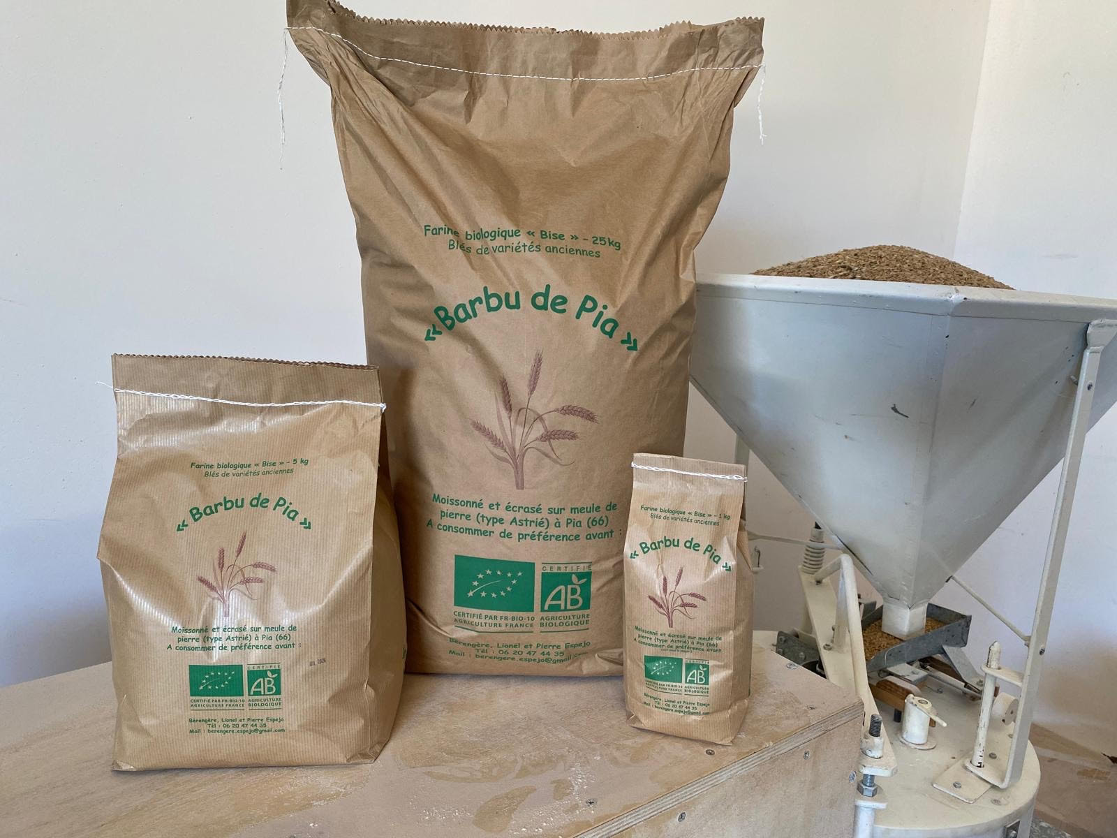 Farine de blé, le « Barbu de Pia » (mélange de variétés anciennes) moissonné et écrasé sur meule de pierre « type Astrié » à Pia (66) en sacs de 1 kg, 5 kg et 25 kg.